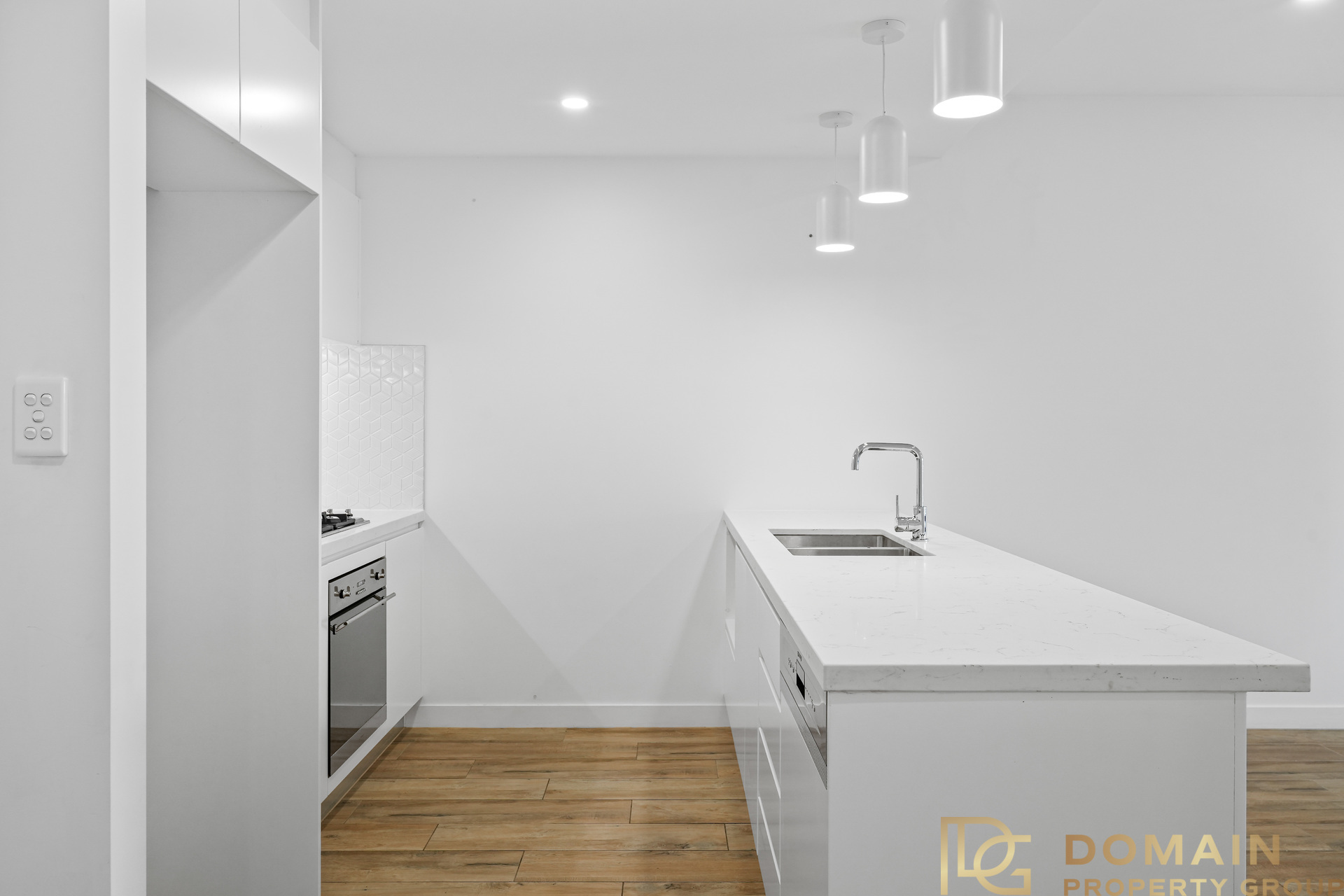 - Gas stove in modern kitchen with dishwasher and pendant feature lights over breakfast bar